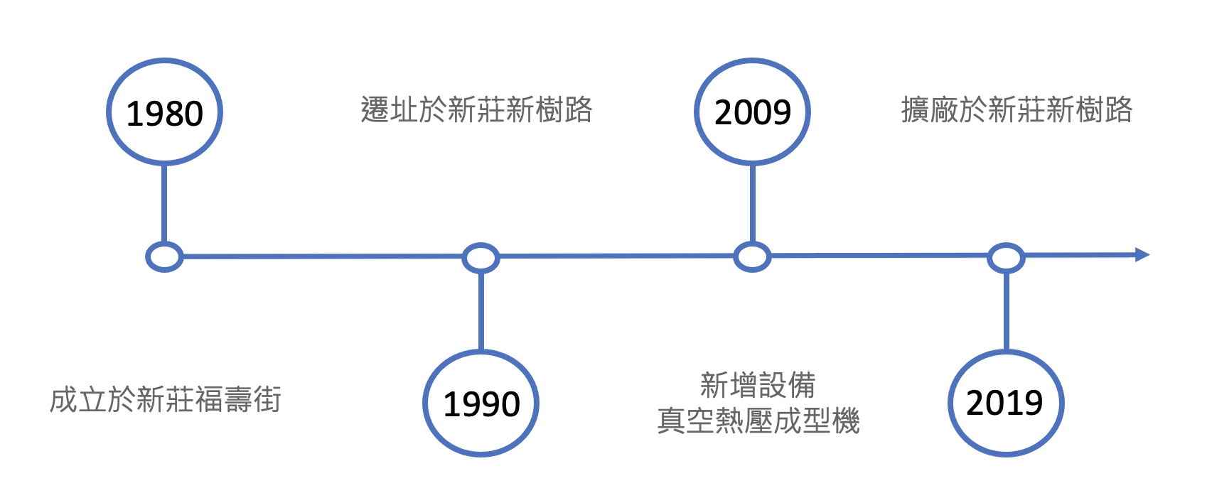 成立於1980年,初期以橡膠製品為主,包含橡膠塞、防震橡膠及橡膠螺絲腳座等零組件。並同時也生產汽機車相關的橡膠零組件。 1990年遷廠於新莊新樹路,並且購入射出成型機台因應需求擴增。